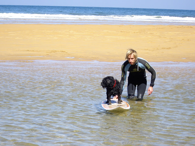Estoy recoplando unas fotos estos dias de cd's etc, y encontré estas. De cuando Boliche tenía unos 11 meses le dí unas clases de surf, no le ví nada mal sobre la tabla y yo tenía grandes planes para el. Por desgracia, creo que el mismo año los ayuntamientos empezarón con los leyes de perros mas estrictos y en verano pobre Boliche no pudó seguir con el surfing :(
